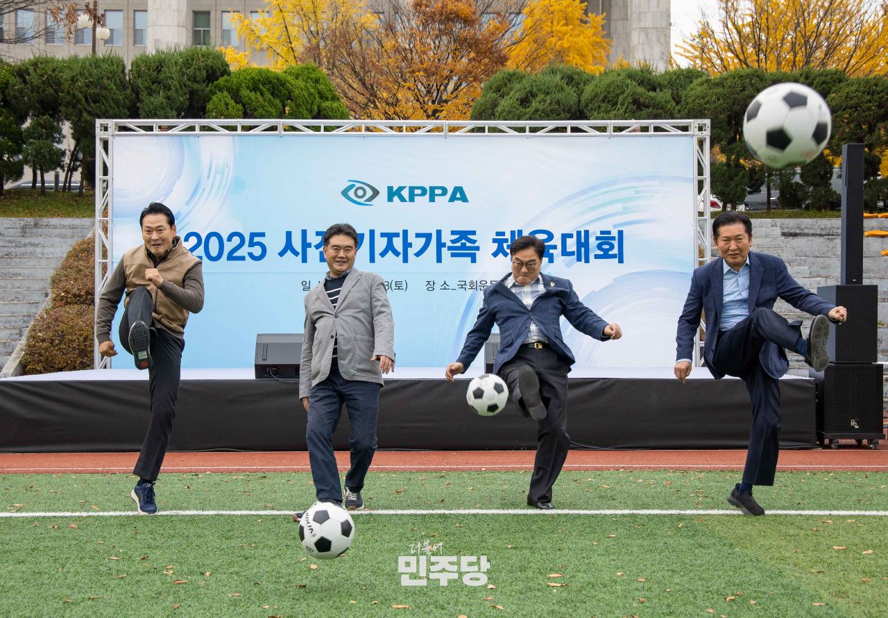 정청래 당대표가 2025.11.08.(토) 국회 운동장에서 열린 2025 사진기자 가족 체육대회에 방문하여 기념시축을 하고 각 언론사 부스를 방문하여 기념촬영을 하고 있다.