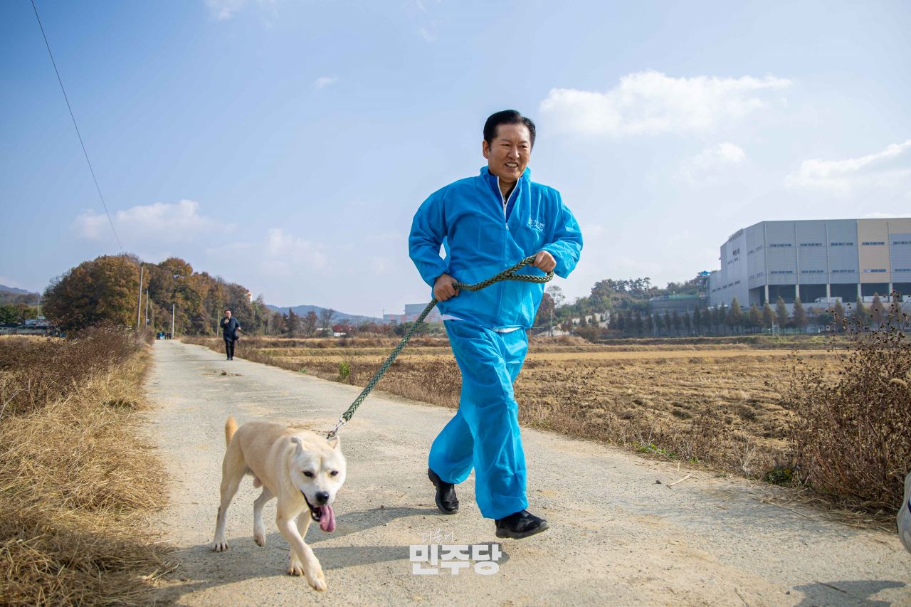 정청래 당대표가 2025.11.09.(일) 용인특례시에 위치한 행복한 강아지들의 집을 방문하여 봉사활동 및 현장간담회를 하고 있다.