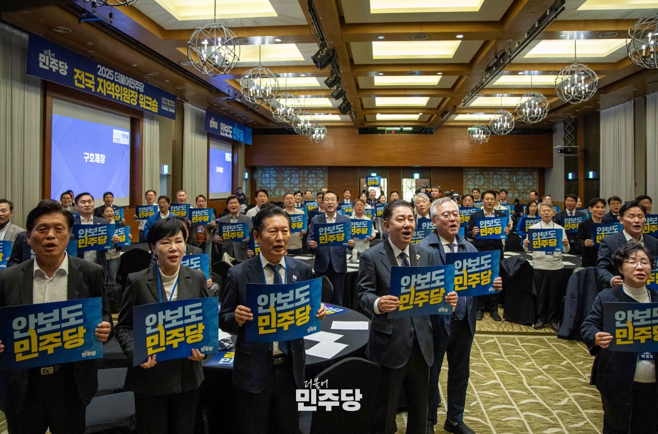 정청래 당대표가 2025.11.11.(화) 경기 광주시에 위치한 곤지암리조트에서 열린 2025 전국지역위원장 워크숍에 참석하여 채택한 결의문을 함께 낭독하고 있다.