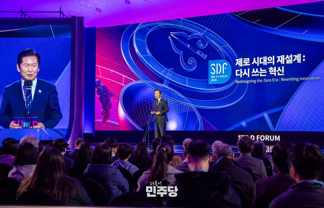 정청래 당대표가 2025.11.13.(금) 서울 동대문구에 위치한 DDP에서 열린 SBS D포럼 2025<제로 시대의 재설계:다시 쓰는 혁신>에 참석하여 축사를 하고 있다.