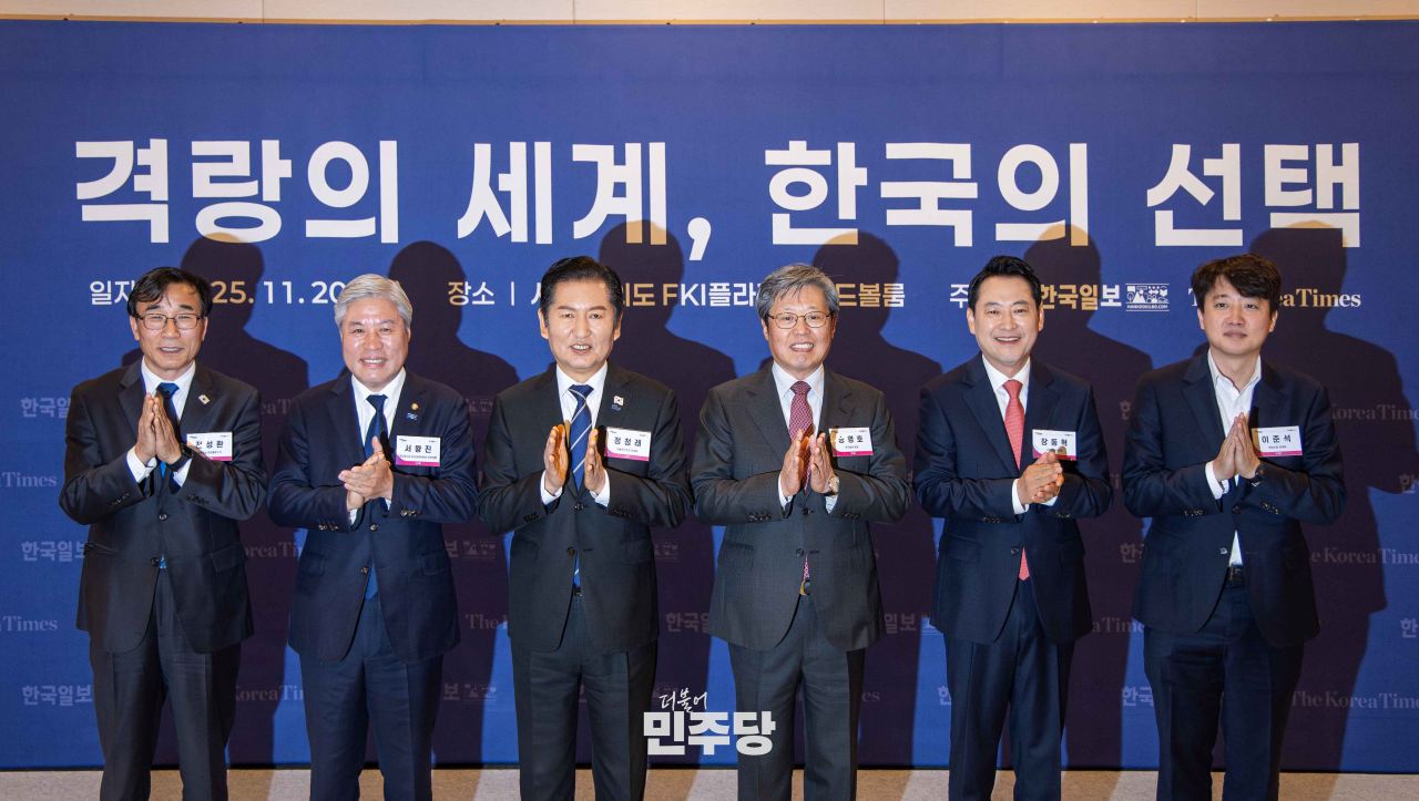 정청래 당대표가 2025.11.20.(목) 여의도에 위치한 FKI플라자 그랜드볼룸에서 열린 2025 한국일보 코라시아 포럼에 참석하여 기념촬영을 하고 있다.