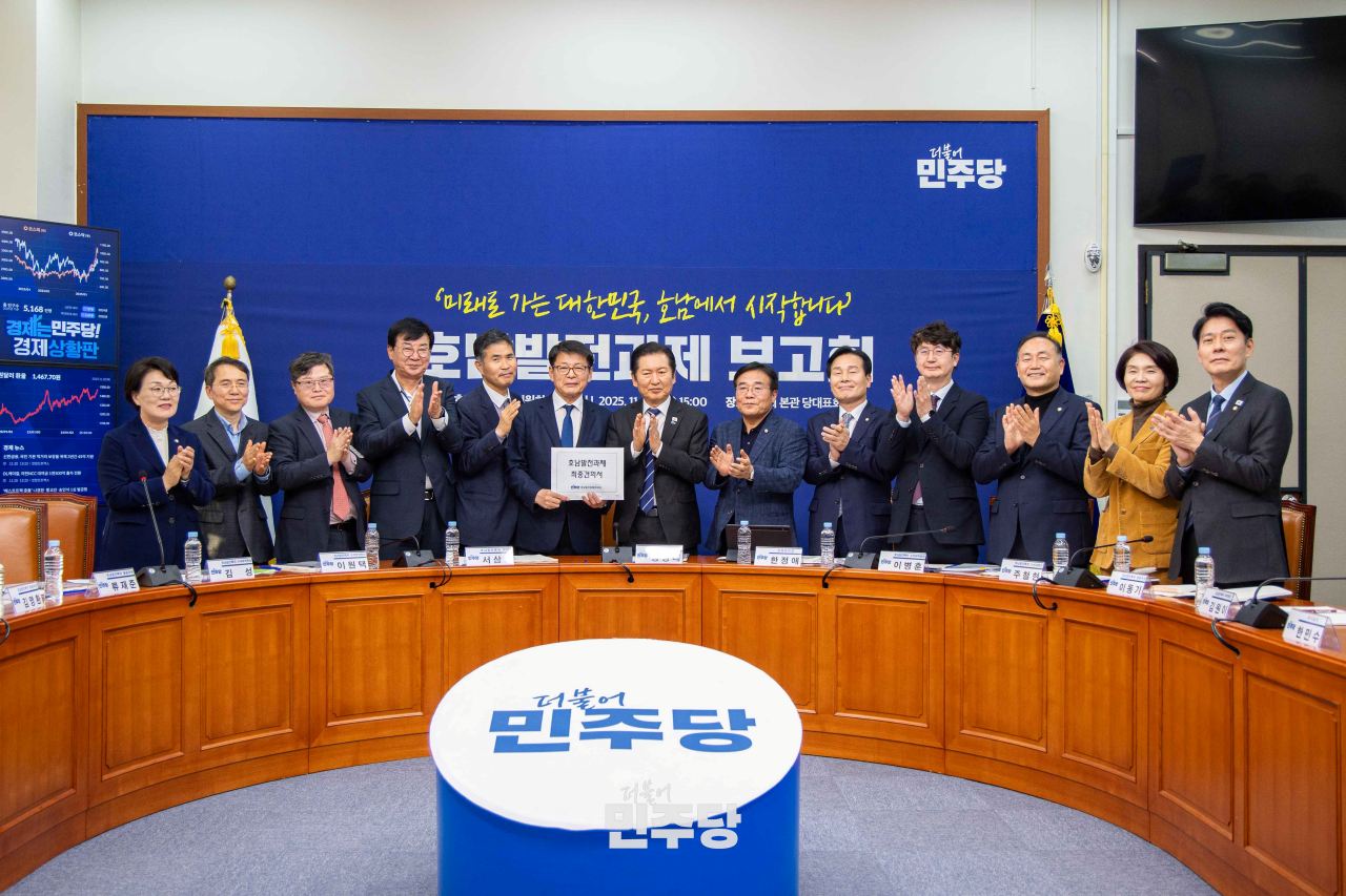 정청래 당대표가 2025.11.20.(목) 국회 본청 당대표회의실에서 열린 호남발전과제 보고회에 참석하여 기념촬영을 하고 있다.