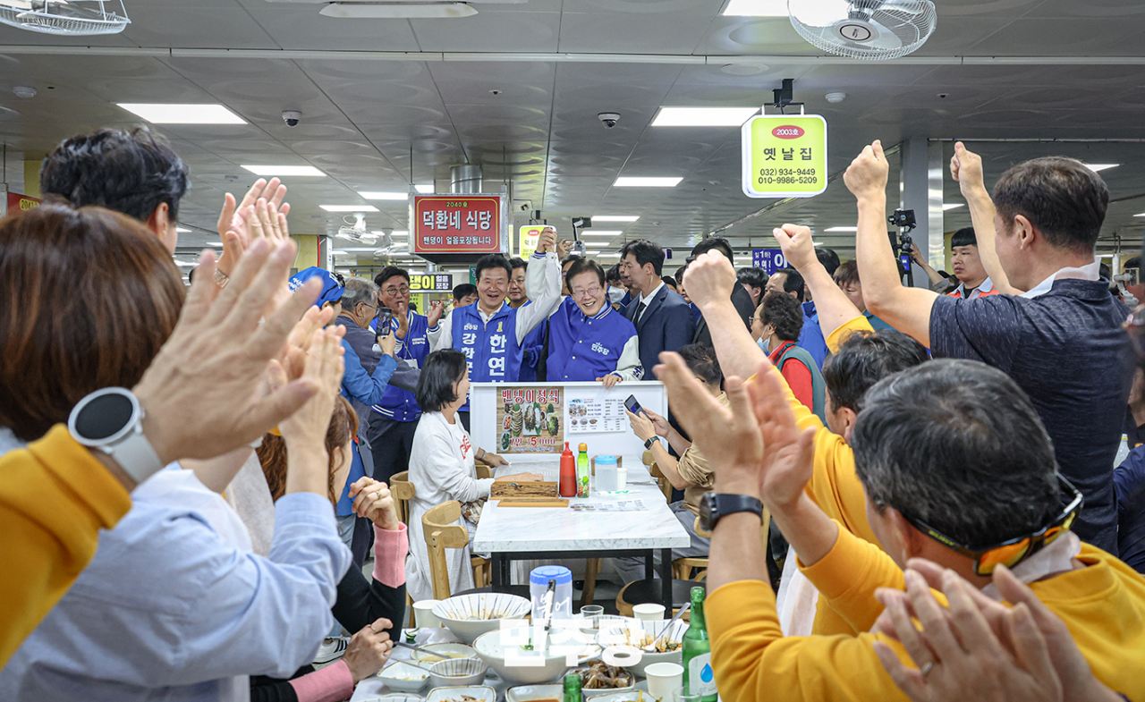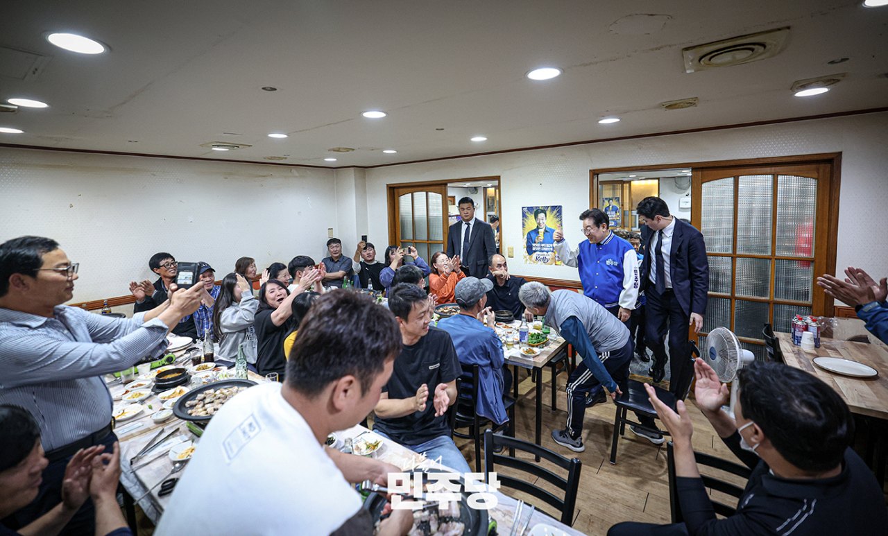 이재명 당대표가 2024.10.05.(토) 강화풍물시장에 방문하여 상인들께 인사를 드리고 식사를 하고 있다.