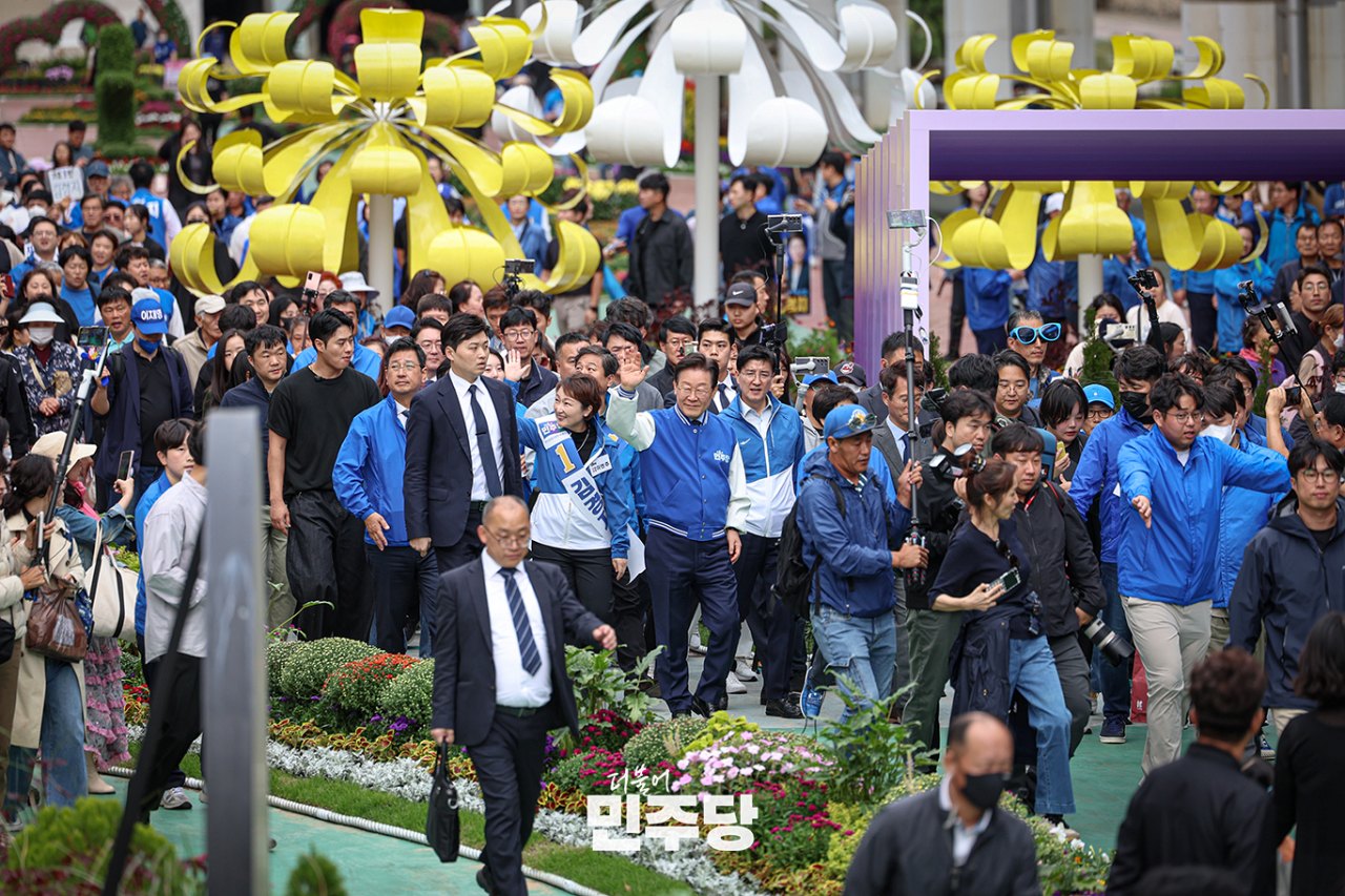 이재명 당대표가 2024.10.09.(수) 부산 금정구에 위치한 이마트 앞에서 김경지 금정구청장 후보 지원유세를 하고 있다.
