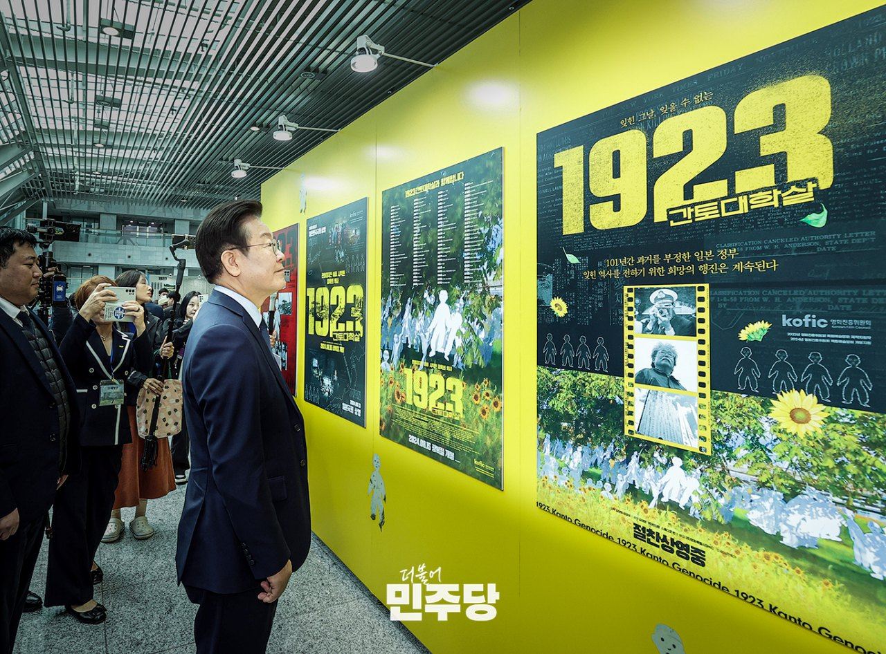 이재명 당대표가 2024.10.23.(수) 국회 의원회관 3층에서 열린 1923 간토대학살 영화 르포컷 전시회에 참석하여 관람을 하고 있다.