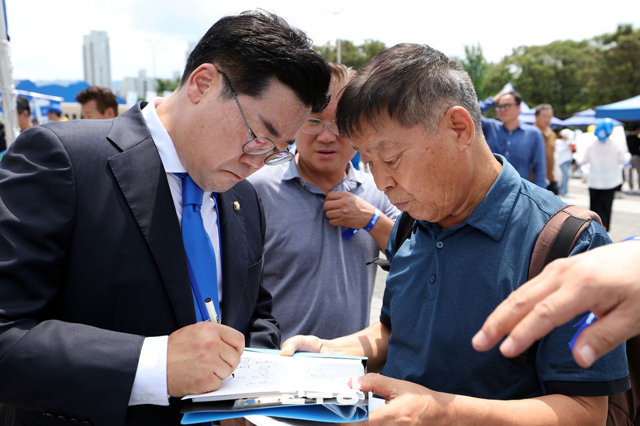 박찬대 당대표 직무대행 겸 원내대표가 2024.08.18.(일) 서울 송파구에 위치한 올림픽공원 한얼광장에서 열린 더불어민주당 블루페에 참석하여 행사들을 즐기고 있다.