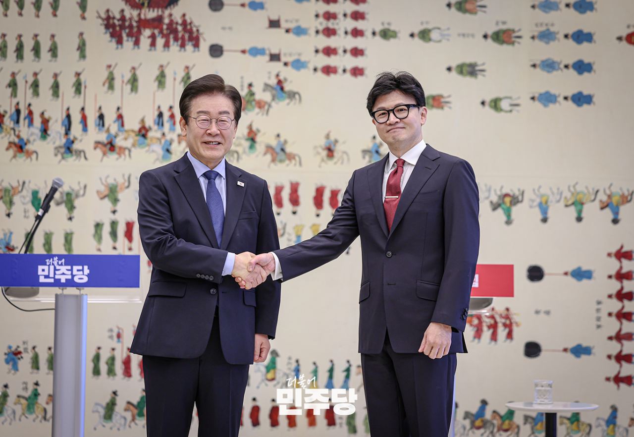 이재명 당대표가 2024.09.01.(일) 국회 본청 오픈홀에서 진행한 국민의힘-더불어민주당 당대표 회담에 참석하여 국민의힘 한동훈 당대표와 기념촬영을 하고 있다.