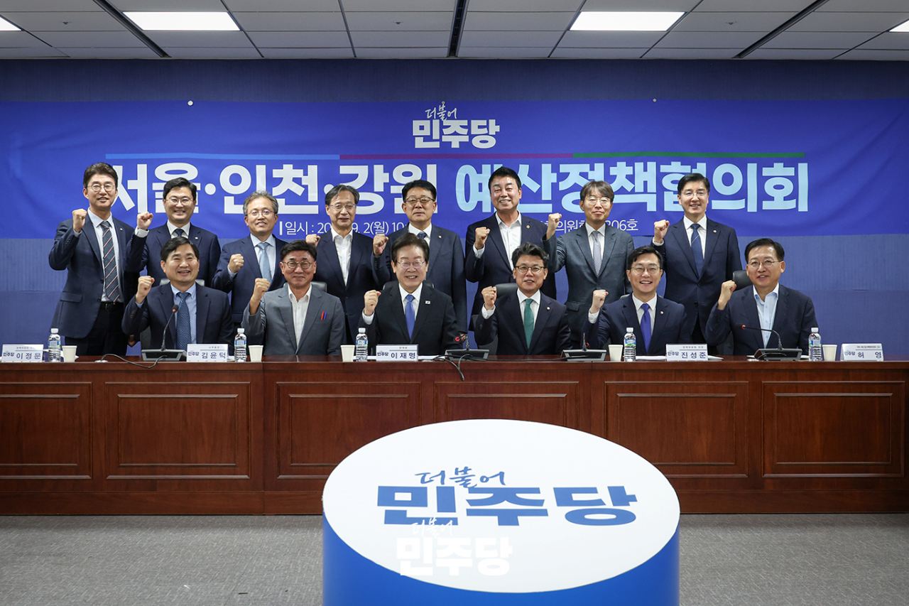 이재명 당대표가 2024.09.02.(월) 국회 의원회관 306호에서 열린 서울ㆍ인천ㆍ강원 예산정책협의회에 참석하여 기념촬영을 하고 있다.