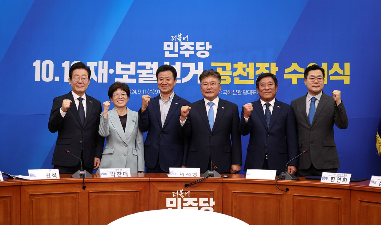 이재명 당대표가 2024.09.11.(수) 국회 본청 당대표회의실에서 열린 10.16 재·보궐선거 공천장 수여식에 참석하여 후보들에게 공천장을 수여하고 기념촬영을 하고 있다.