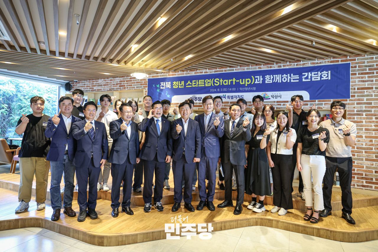 박찬대 당대표 직무대행 겸 원내대표가 2024.08.03.(토) 전북 익산시에 위치한 전북청년허브센터에서 열린 전북 청년과 함께하는 스타트업 간담회에 참석하여 기념촬영을 하고 있다.
