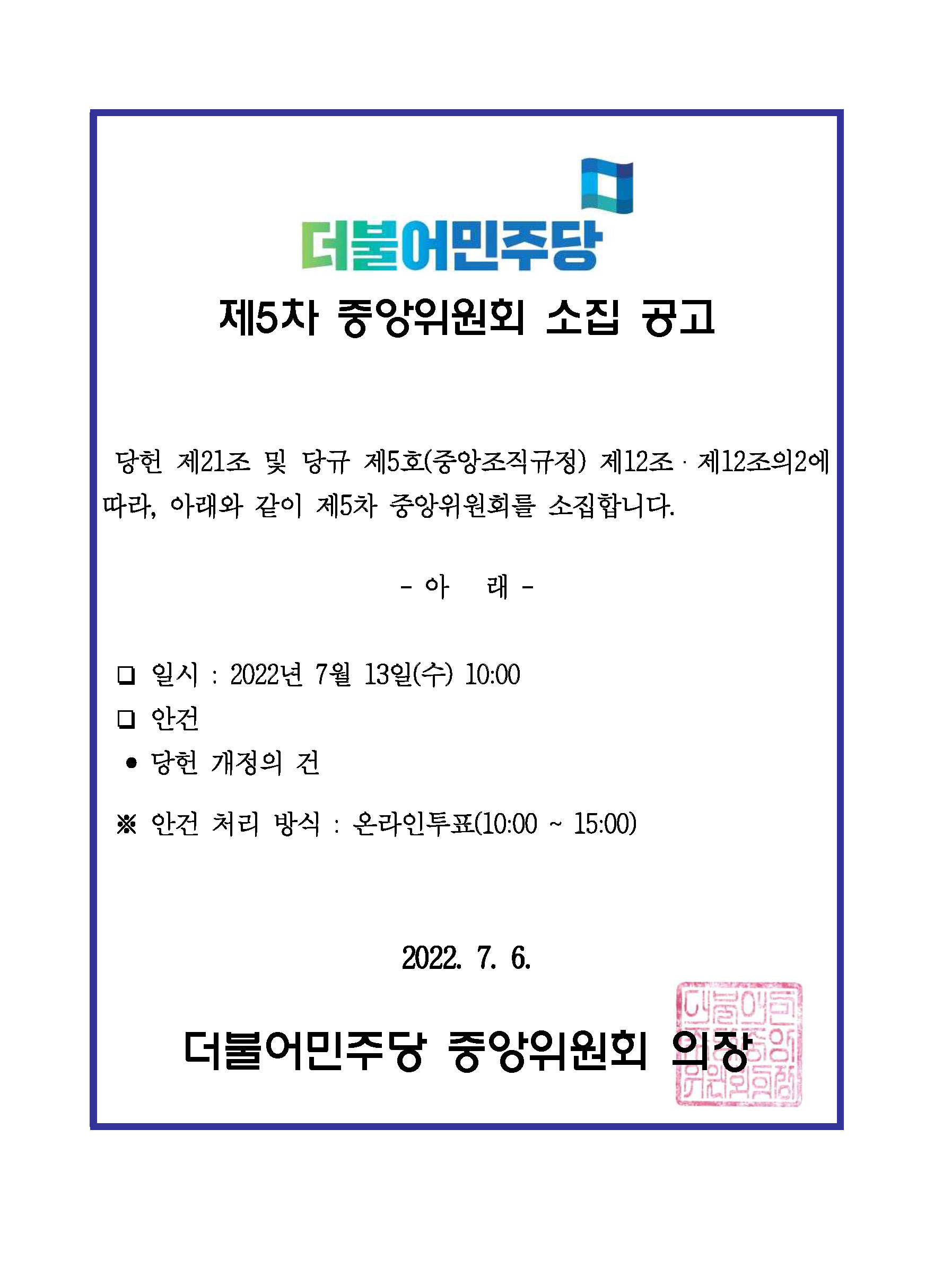 제5차 중앙위원회 소집 및 당헌 개정안 공고