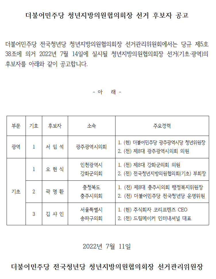 더불어민주당 전국청년당 청년지방의원협의회(기초·광역) 회장 선출을 위한 선거 실시 및 후보자 등록 공고