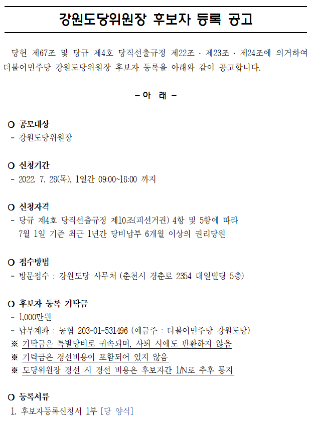 강원도당위원장 후보자 등록 공고
