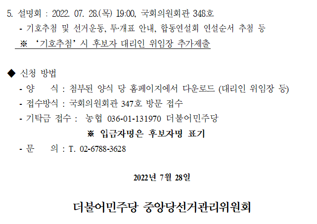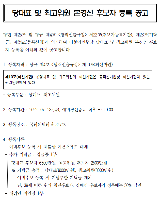 당대표 및 최고위원 본경선 후보자 등록 공고