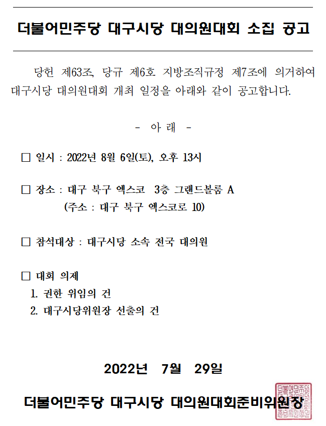 더불어민주당 대구시당 대의원대회 소집 공고