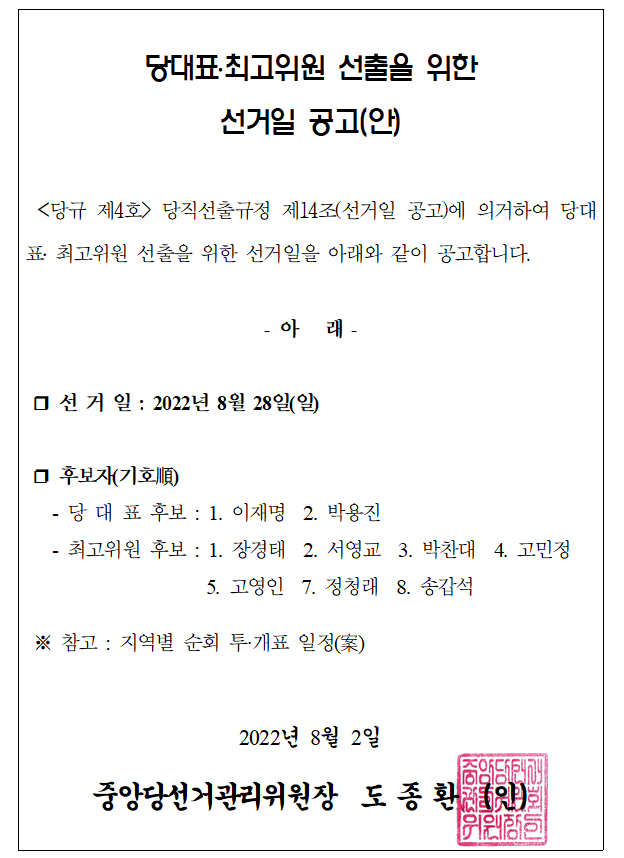 당대표·최고위원 선출을 위한 선거일 공고
