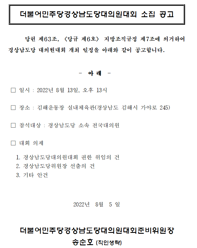 더불어민주당경상남도당대의원대회 소집 공고