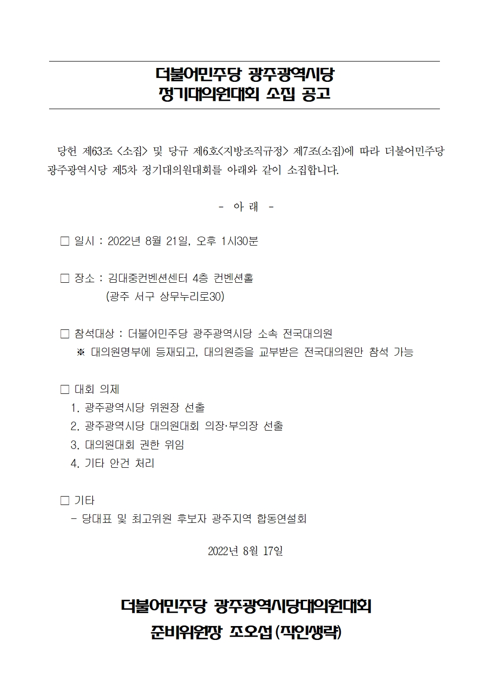 더불어민주당 광주광역시당 정기대의원대회 소집 공고