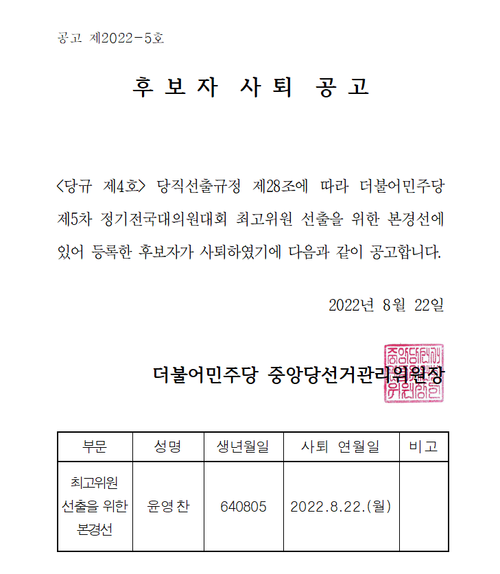 최고위원 후보자 사퇴 공고