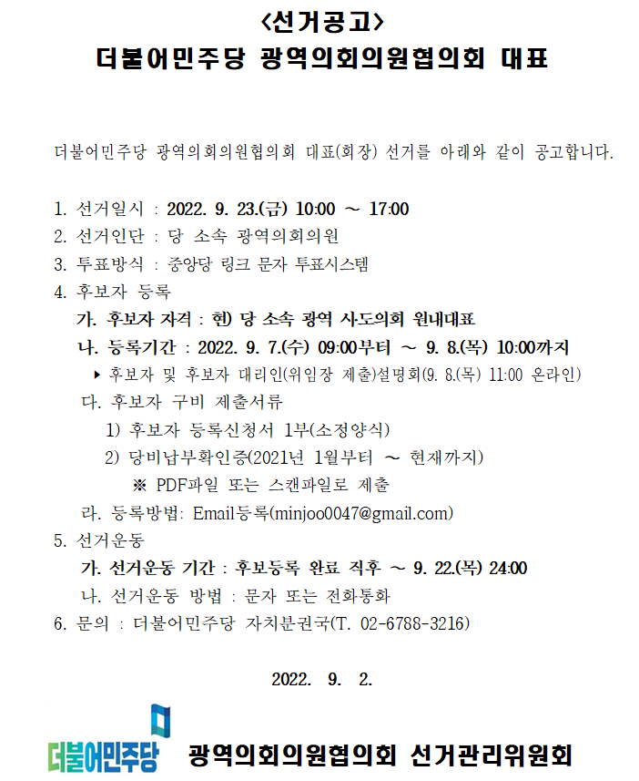 더불어민주당 광역의회의원협의회 대표 선거 공고