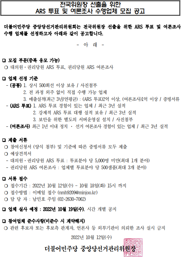 전국위원장 선출을 위한 ARS투표 및 여론조사 수행업체 모집 공고