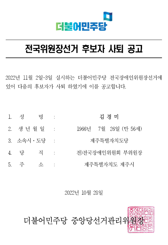 전국위원장 선거 후보자 사퇴 공고