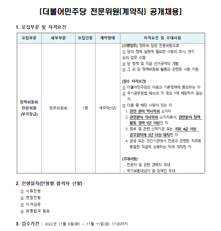 더불어민주당 전문위원(계약직) 공개채용