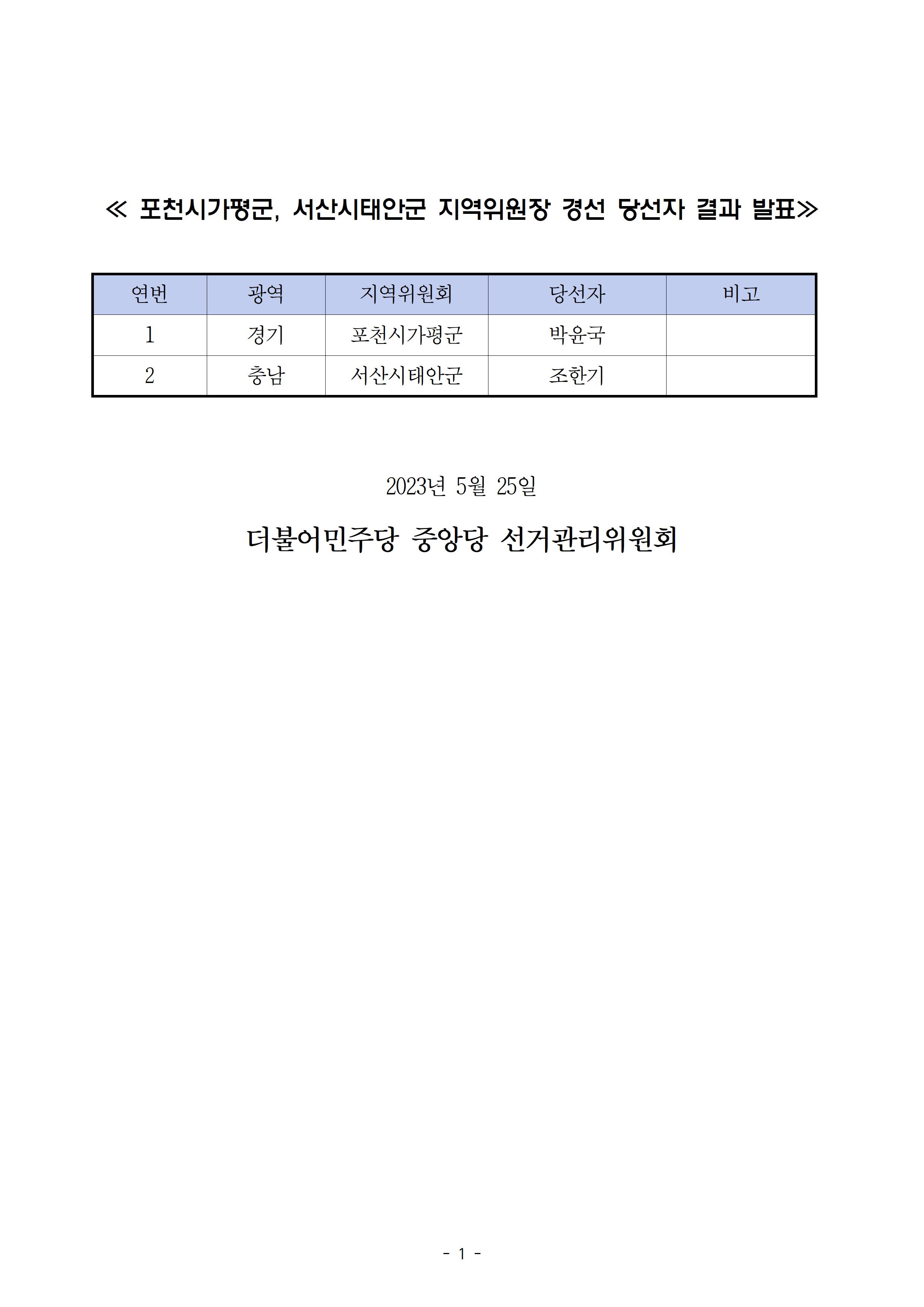 포천시가평군, 서산시태안군 지역위원장 경선 당선자 결과 발표