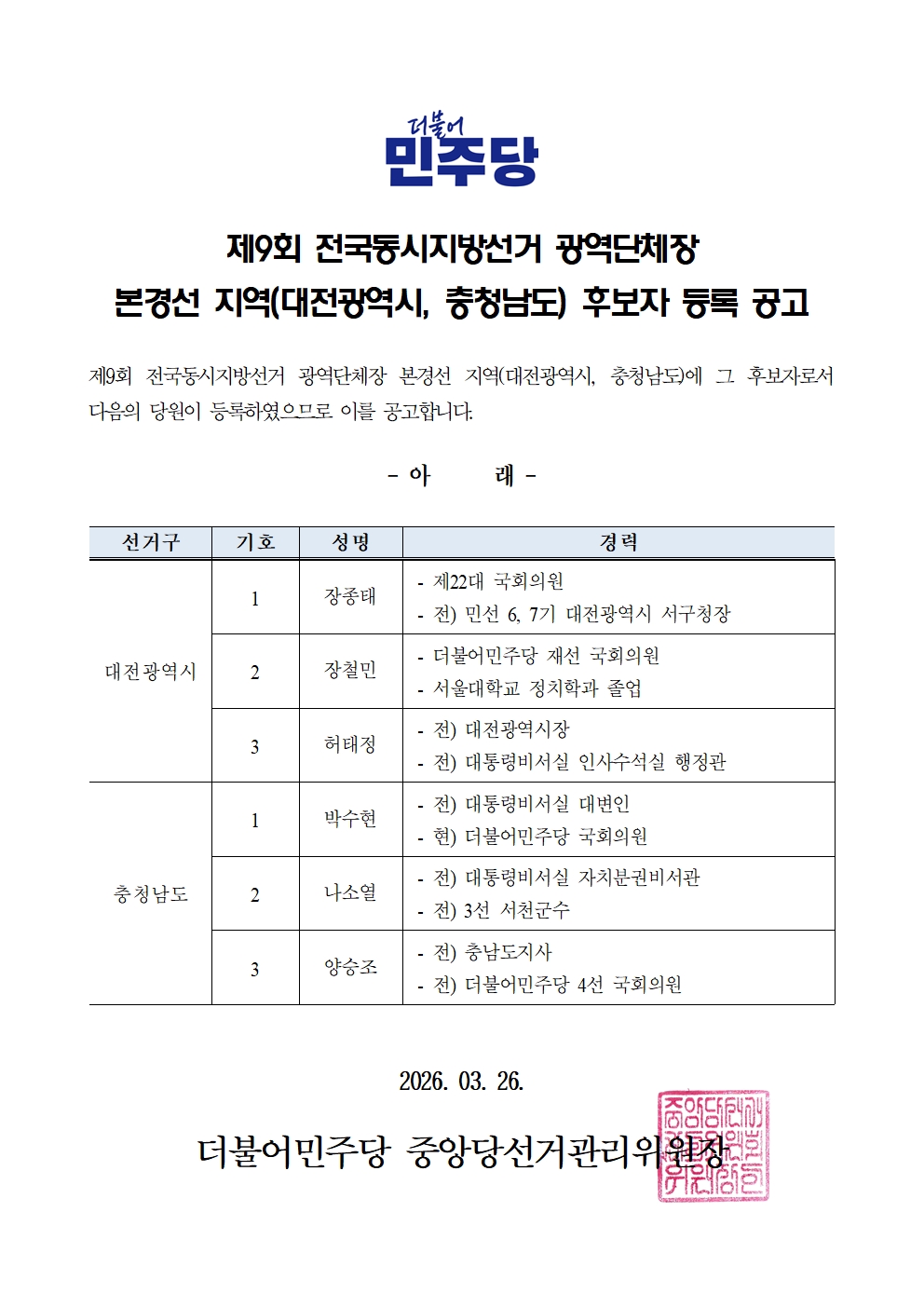 제9회 지방선거 광역단체장 본경선 지역(대전광역시, 충청남도) 후보자 등록 공고(수정)