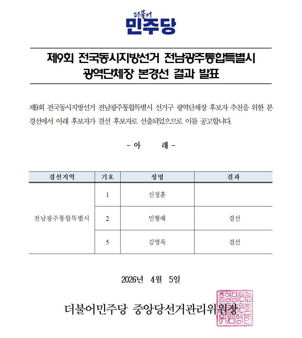 제9회 전국동시지방선거 전남광주통합특별시 광역단체장 본경선 결과 발표