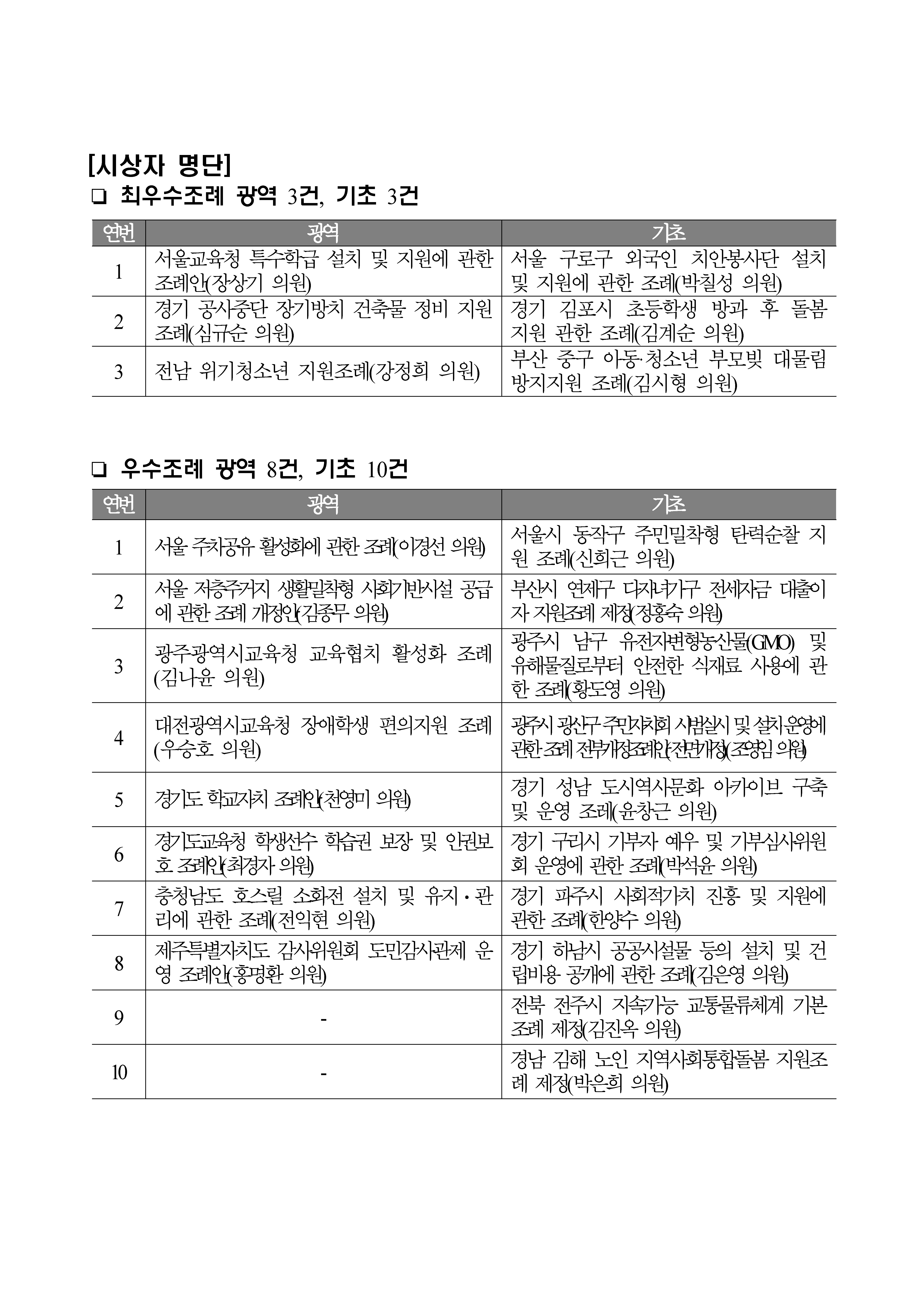 □ 이날 시상식에는 최우수상으로 광역의원·기초의원 각각 3명과 우수상으로 광역의원 8명, 기초의원 10명에게 상장을 수여한다. 최우수상은 이해찬 당대표가 시상하고, 우수상은 김두관 참좋은지방정부위원장이 시상할 예정이다.