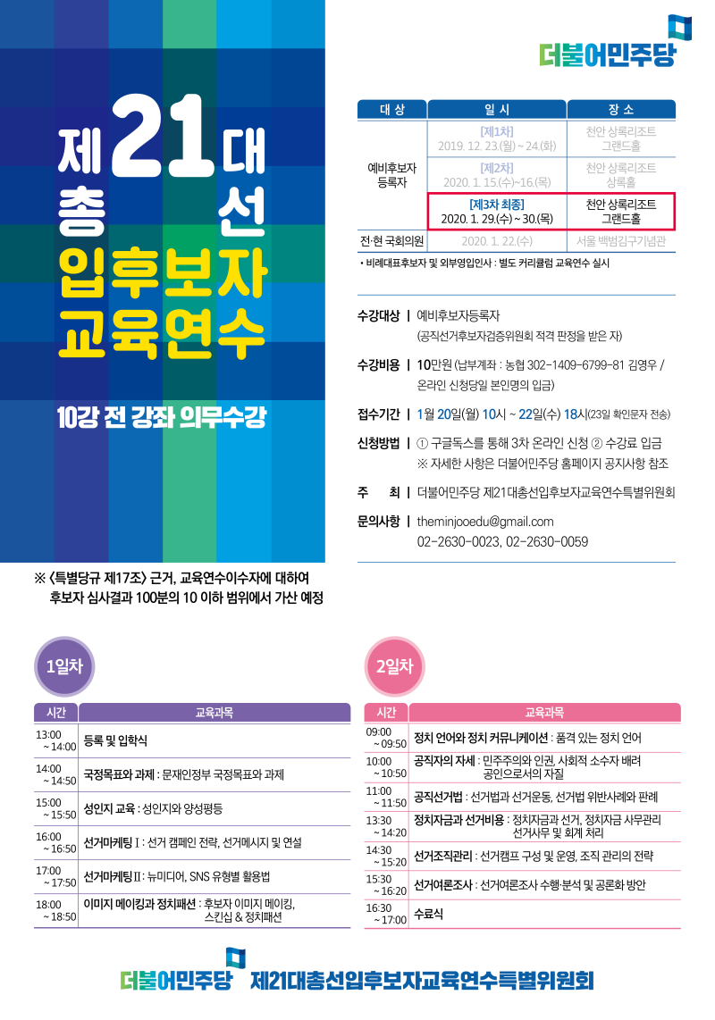 더불어민주당 21대총선입후보자교육연수특별위원회는 제21대 총선 입후보자를 대상으로 제3차 교육연수를 아래와 같이 진행합니다모든 입후보자는 의무적으로’ 본 교육연수를 이수하여야 합니다.