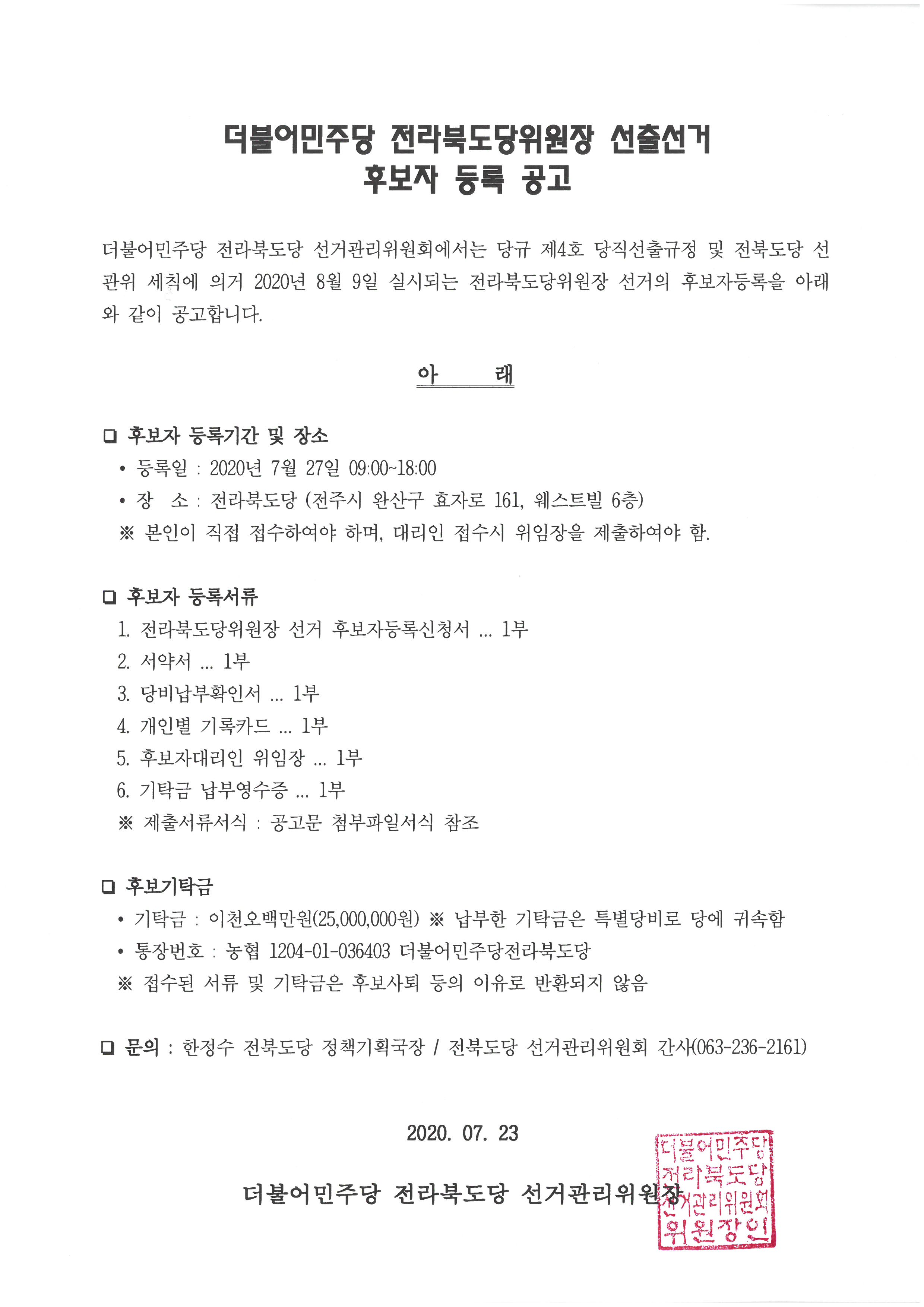 더불어민주당 전라북도당위원장 선출선거 후보자 등록 공고