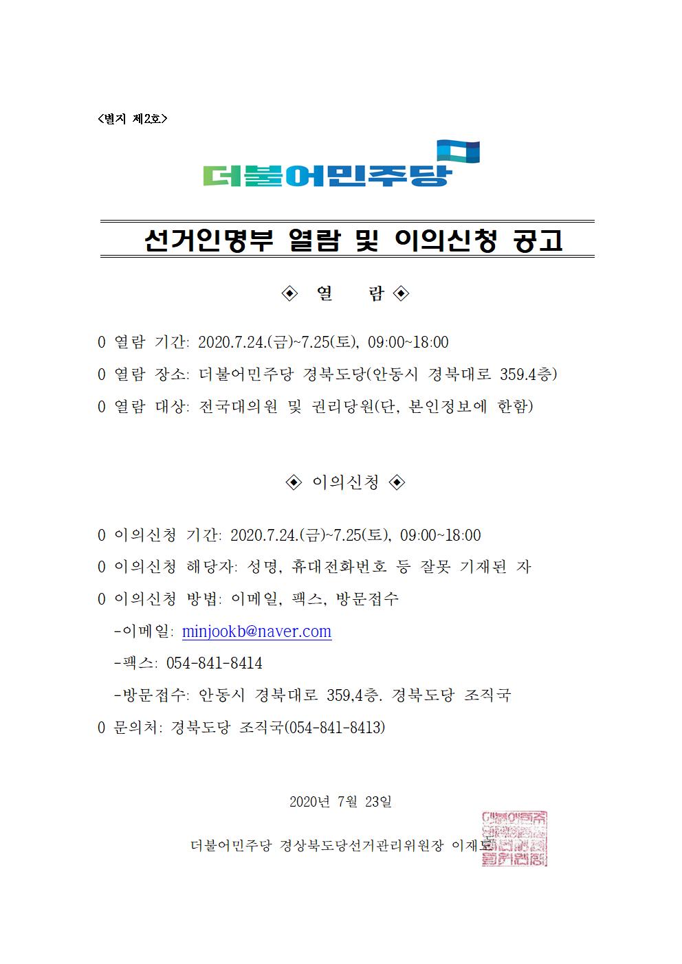 경북도당위원장 선거 선거인명부 열람 및 이의신청 공고
