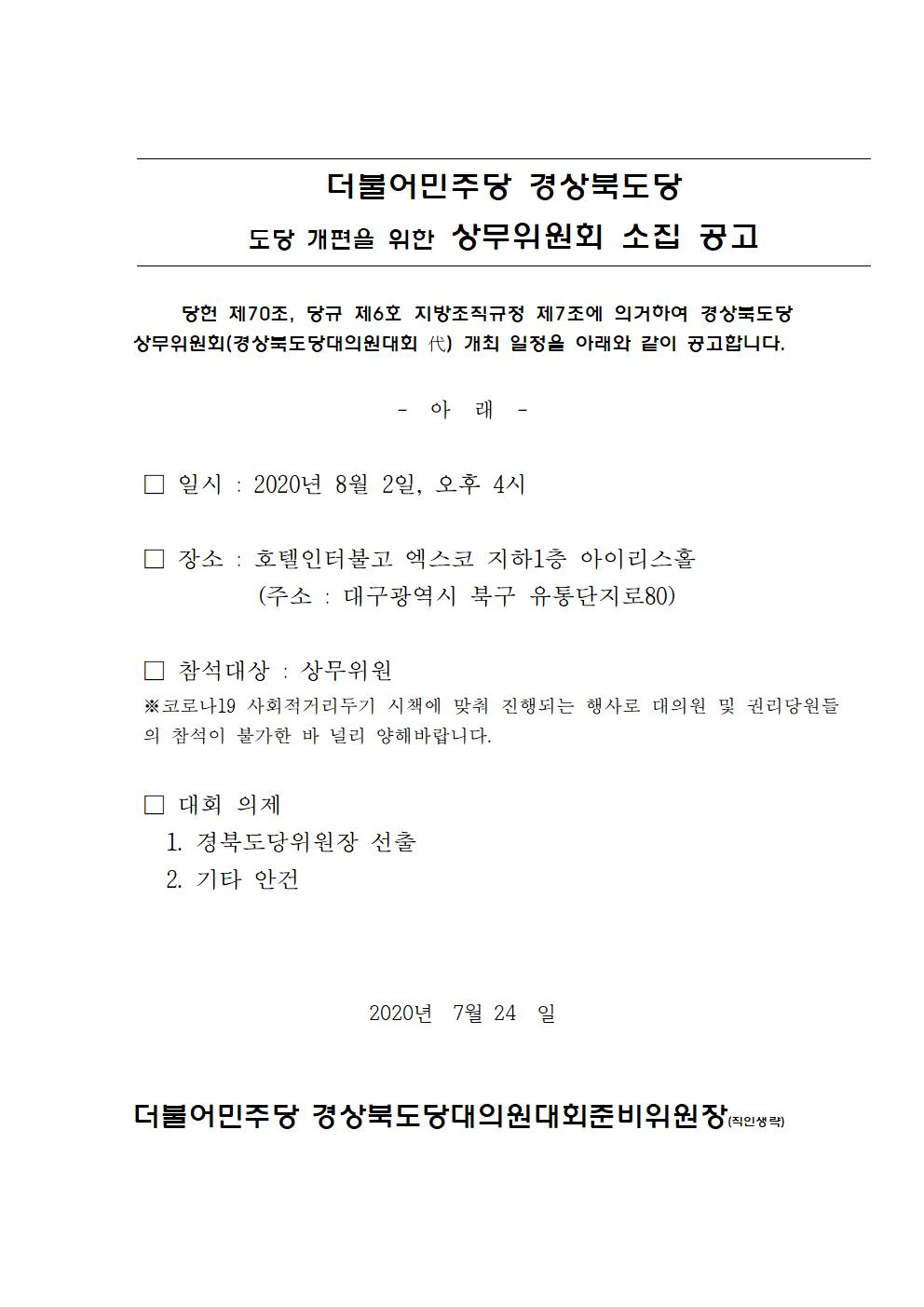 더불어민주당 경상북도당 상무위원회 개최 공고