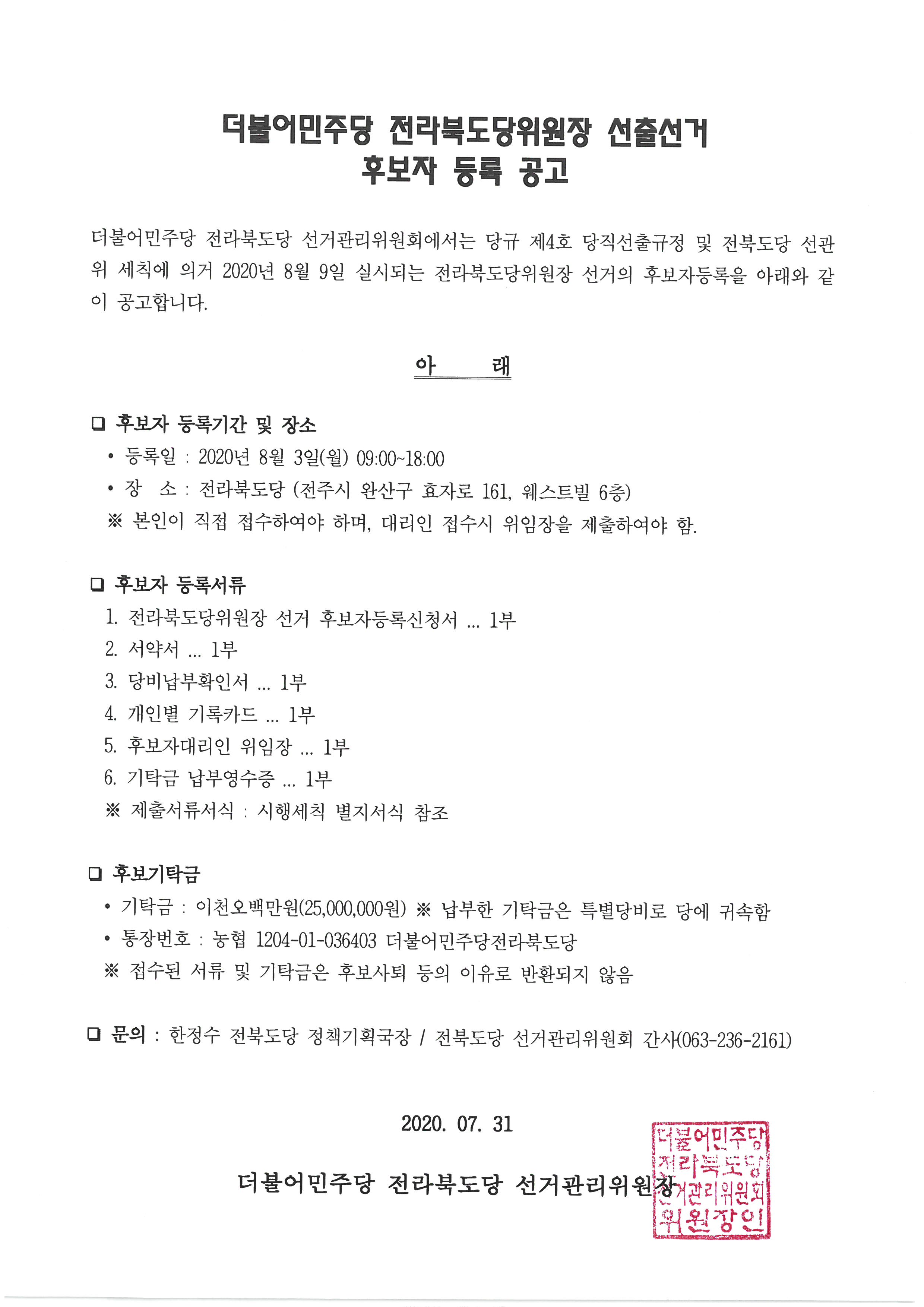 더불어민주당 전라북도당위원장 선출선거 후보자 등록 공고