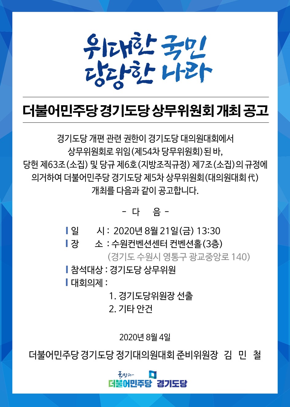 더불어민주당 충청북도당 시‧도당 개편을 위한 상무위원회 소집 공고