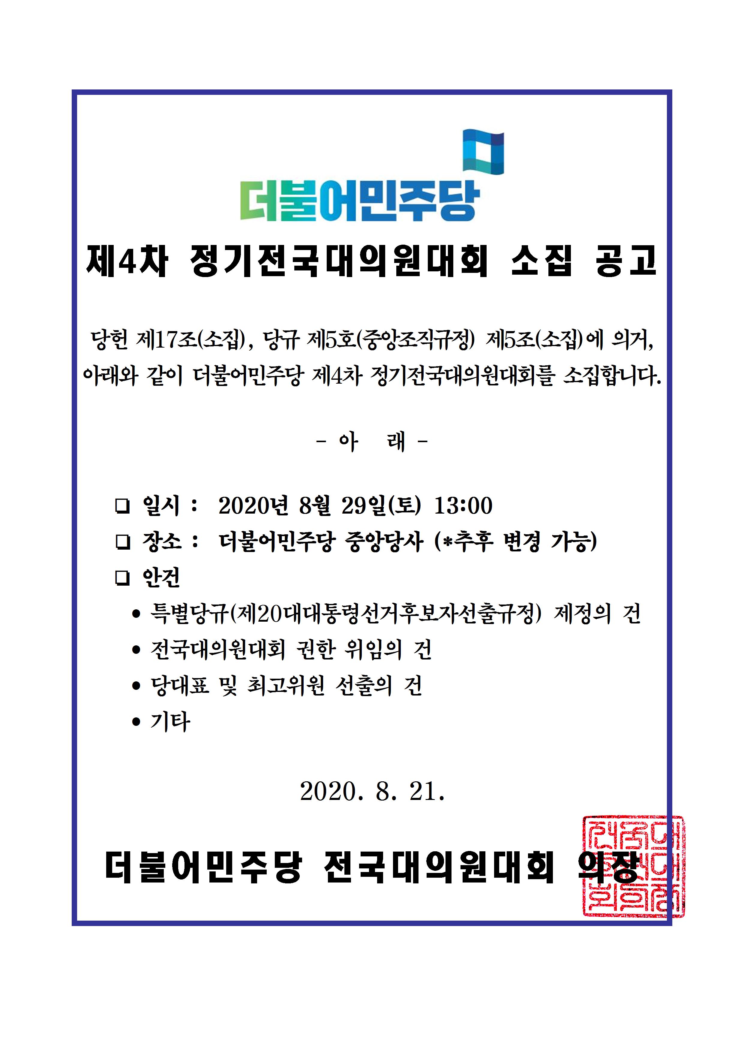 제4차 정기전국대의원대회 소집 공고