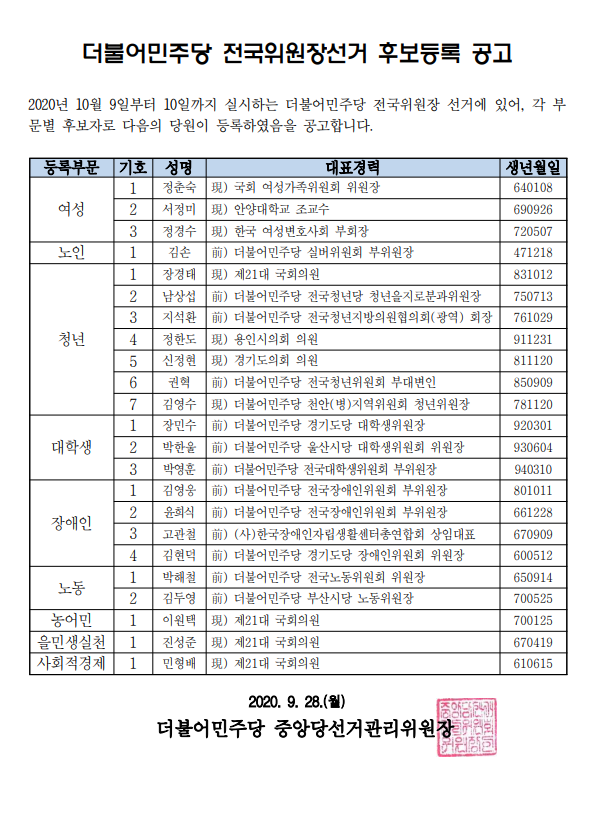 더불어민주당 전국위원장선거 후보등록 공고