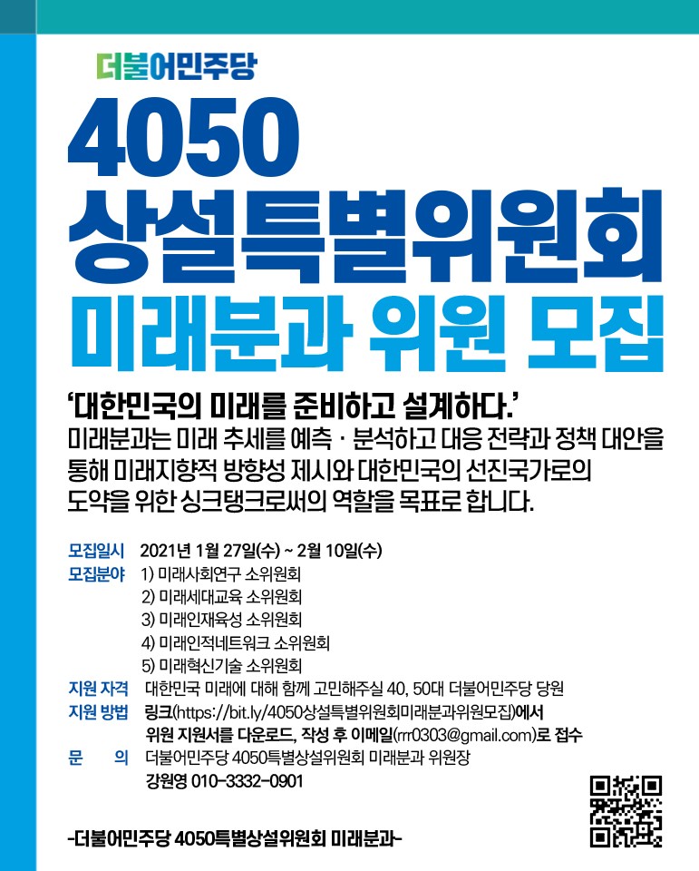 - 문의 : 더불어민주당 4050특별상설위원회 미래분과 위원장 강원영 010-3332-0901