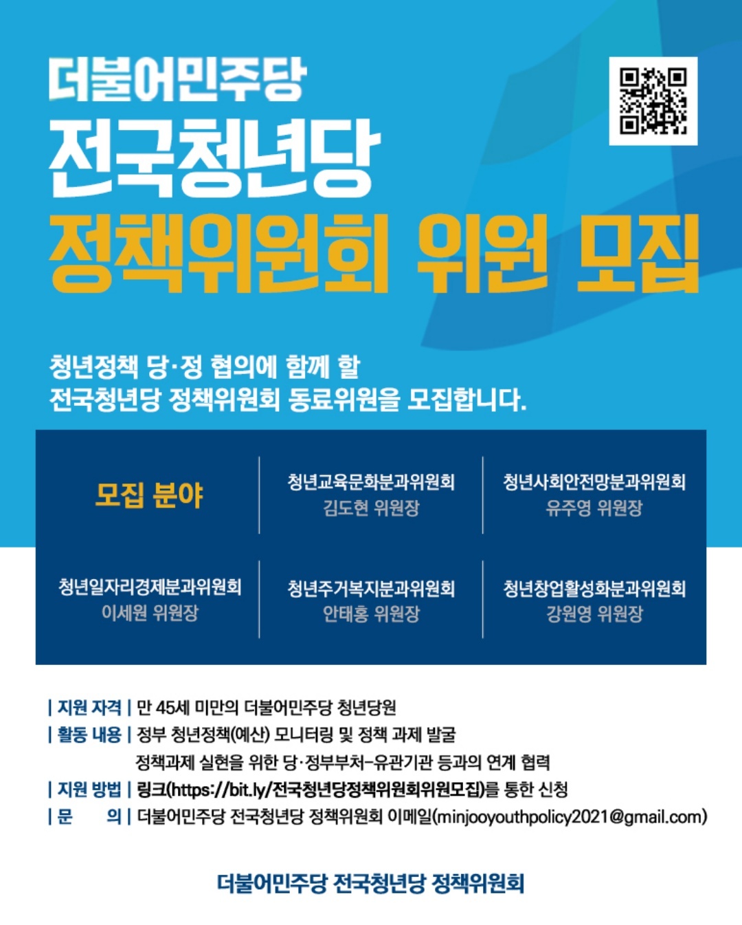 - 지원 방법 : 링크(https://bit.ly/전국청년당정책위원회위원모집) 를 통한 신청