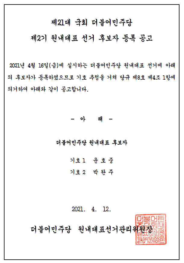 제21대 국회 더불어민주당 제2기 원내대표 선거 후보자 등록 공고