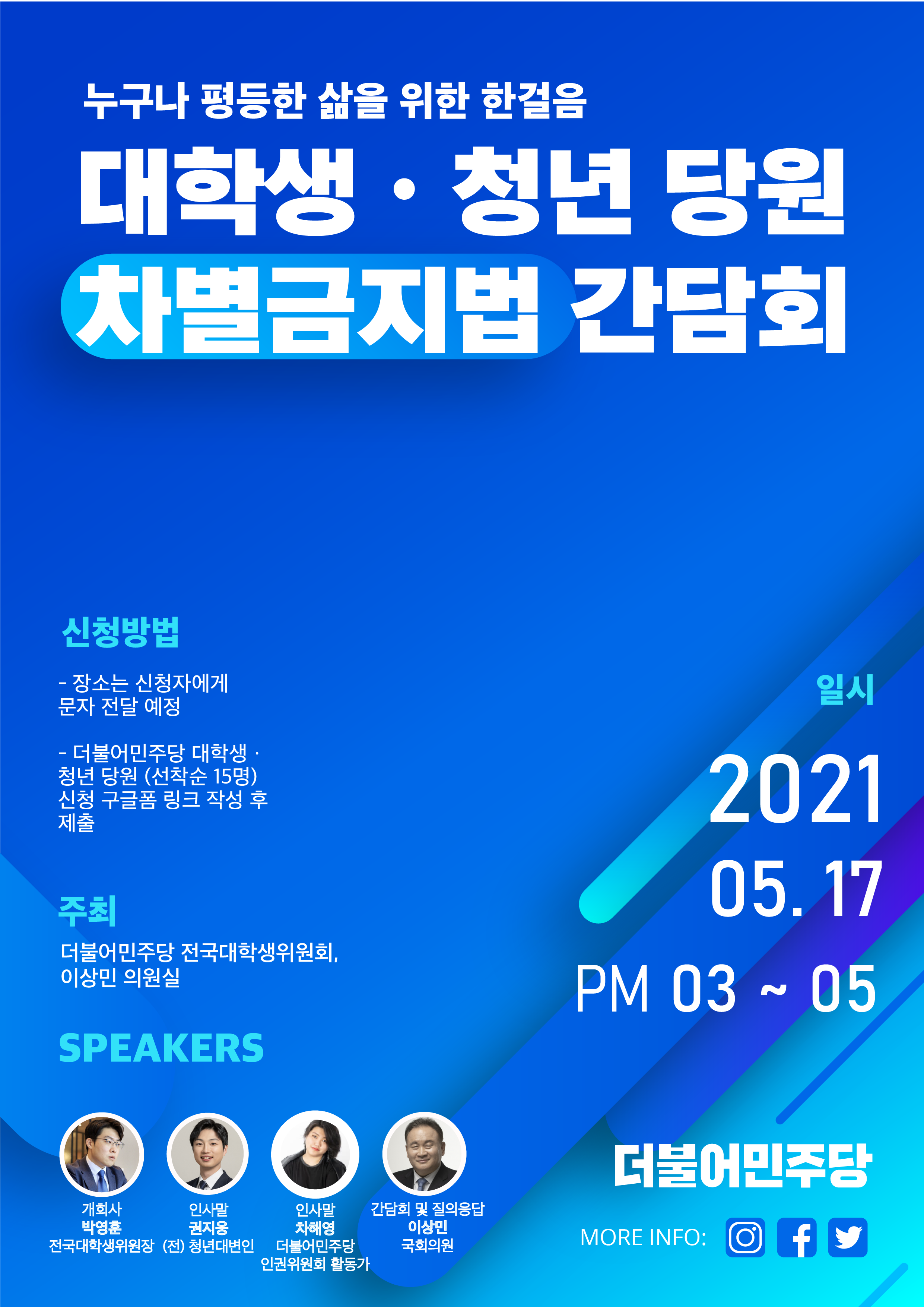 이에 더불어민주당 전국대학생위원회와 이상민 의원실은 차별금지법의 입법 현황을 공유하고 대학생과 청년의 목소리를 담기 위한 "대학생, 청년 당원 차별금지법 간담회"를 아래와 같이 개최합니다.