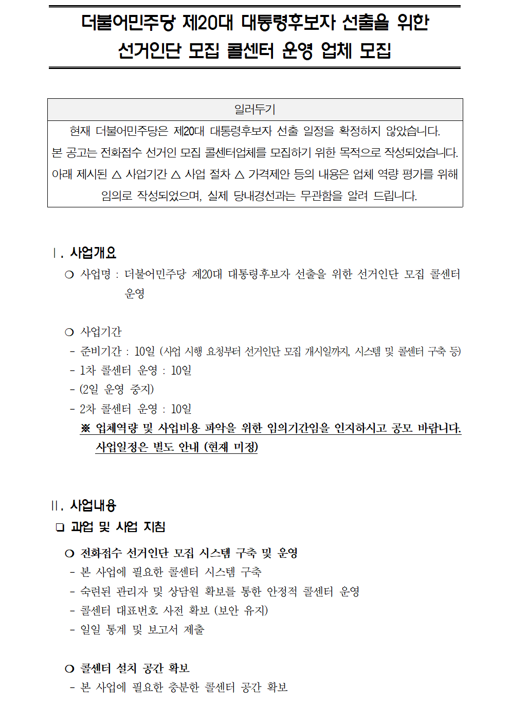 더불어민주당 제20대 대통령후보자 선출을 위한 선거인단 모집 콜센터 운영업체 모집공고