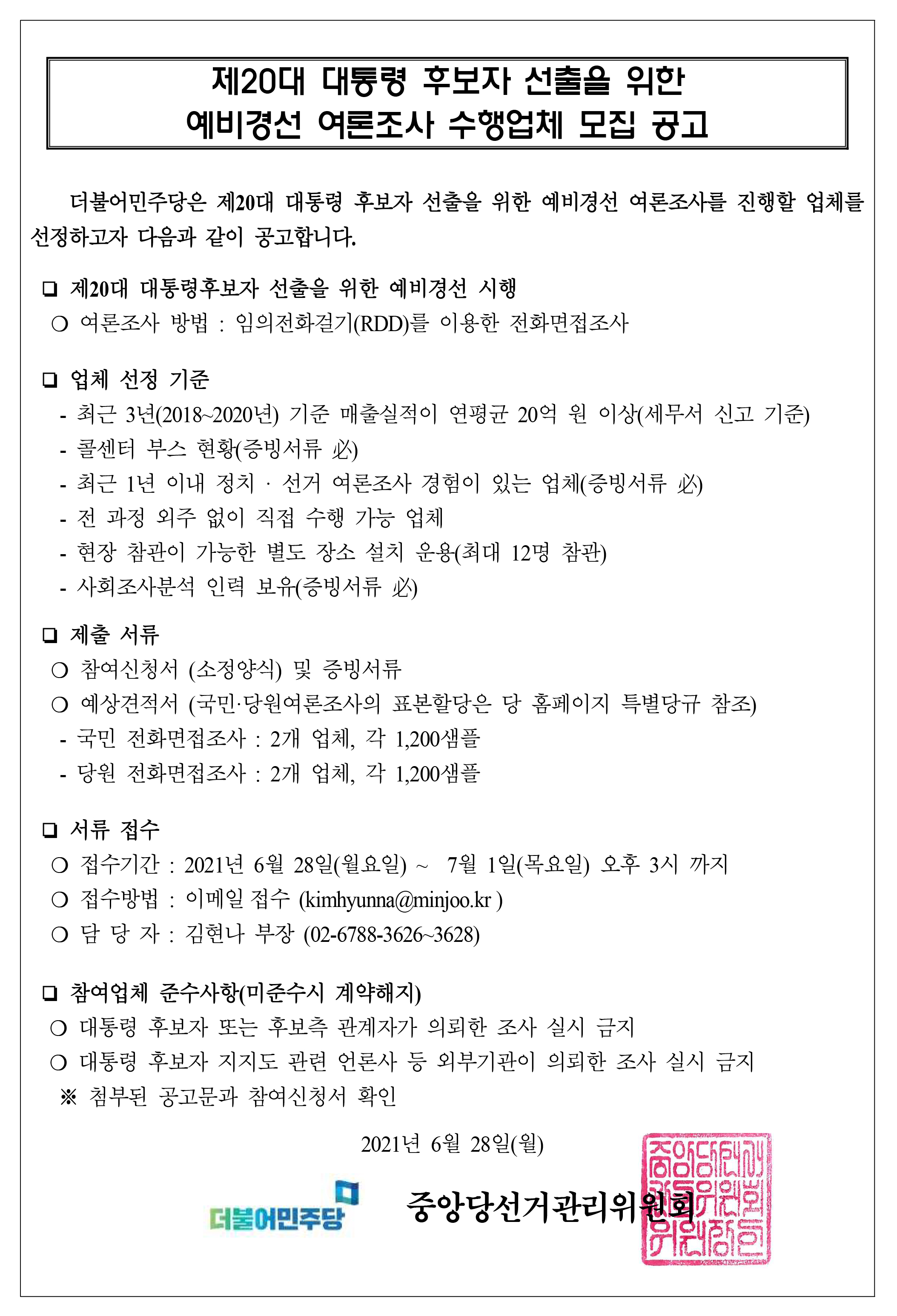 제20대 대통령 후보자 선출을 위한 예비경선 여론조사 수행업체 모집 공고