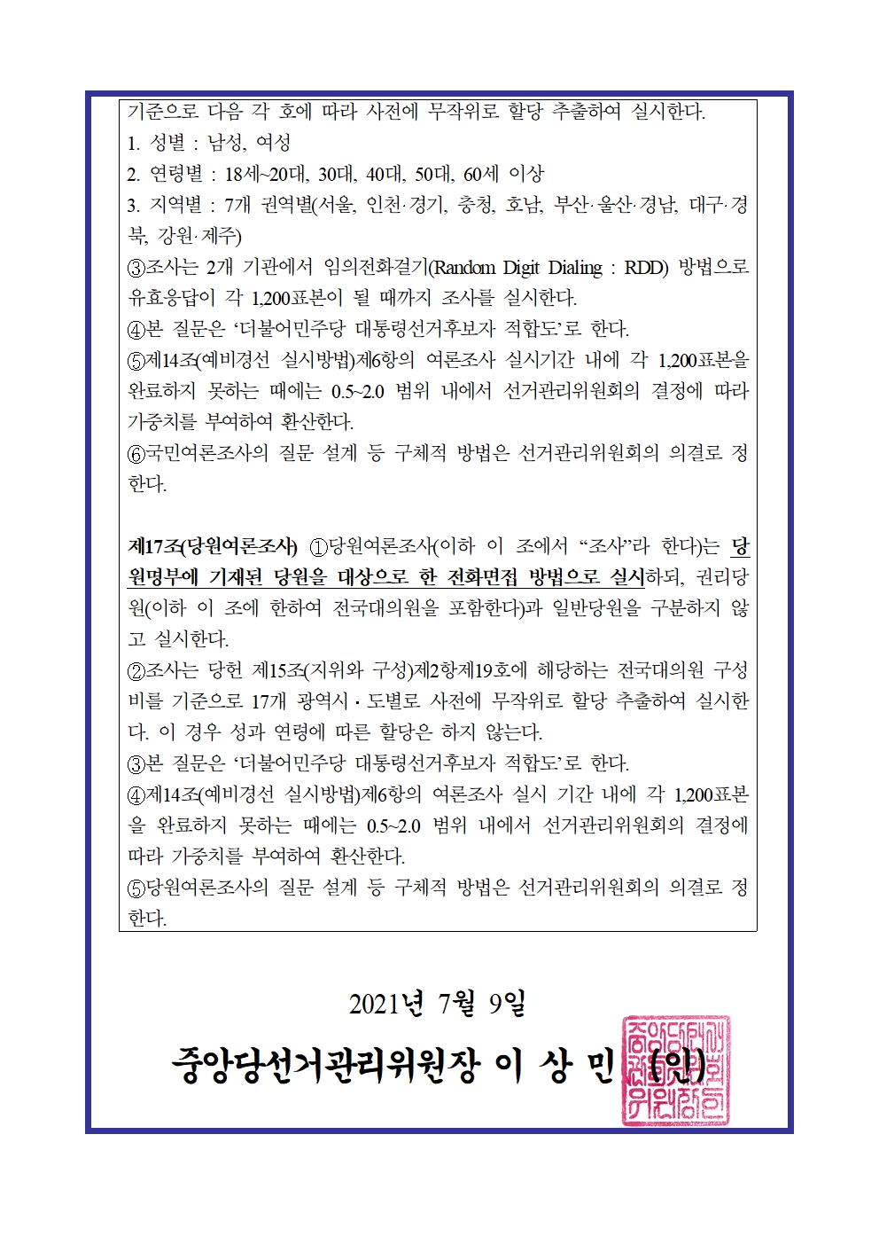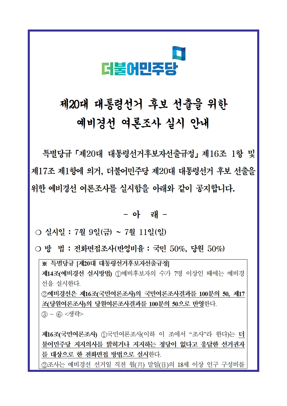제20대 대통령선거 후보 선출을 위한 예비경선 여론조사 실시 안내