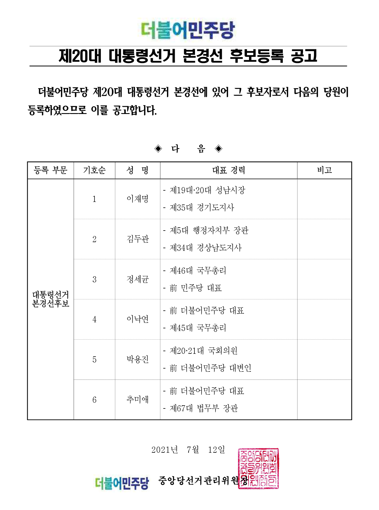 제20대 대통령선거 후보 선출을 위한 본경선후보자 등록 접수 공고