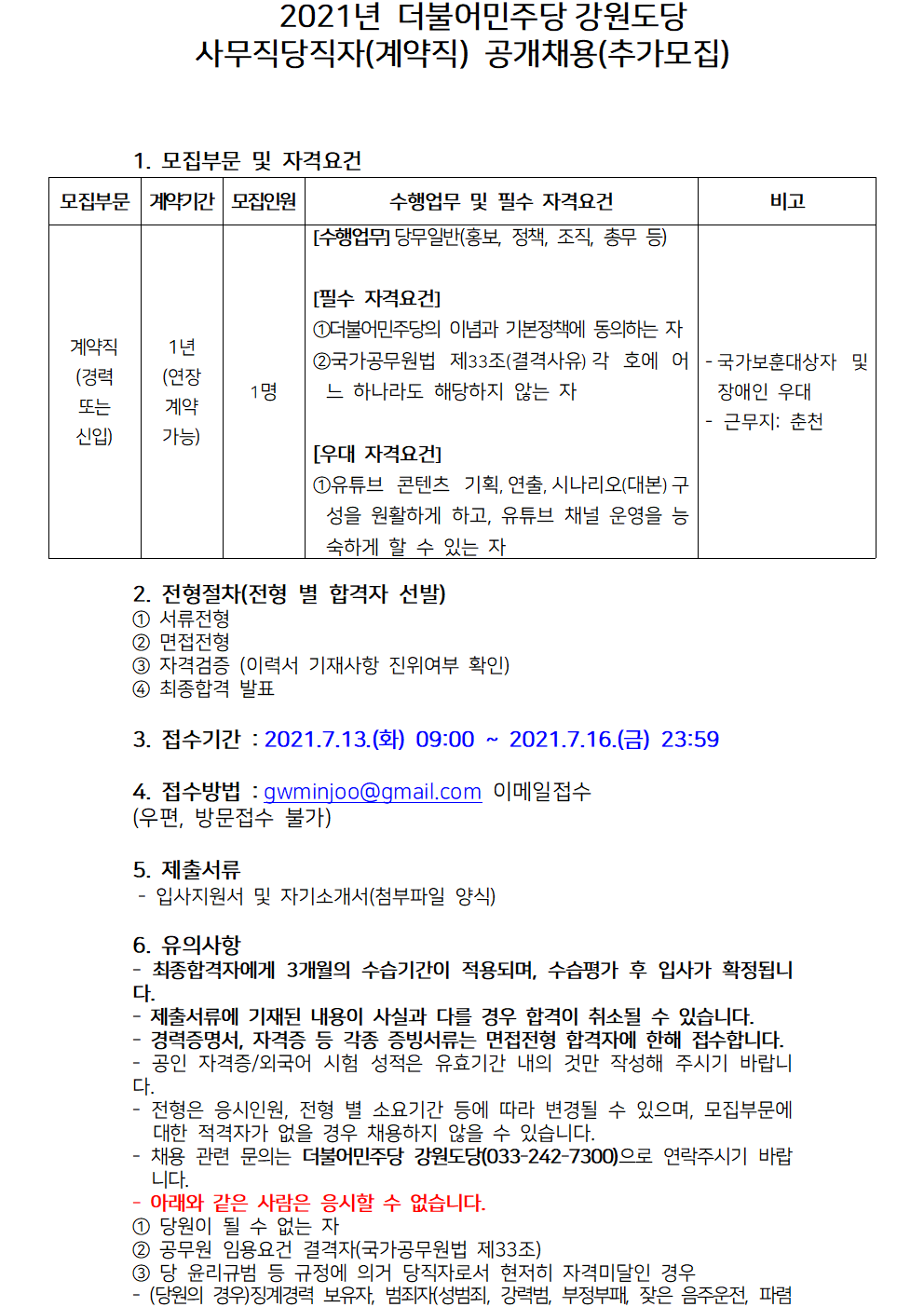 2021년 더불어민주당 강원도당 사무직당직자(계약직) 공개채용(추가모집)