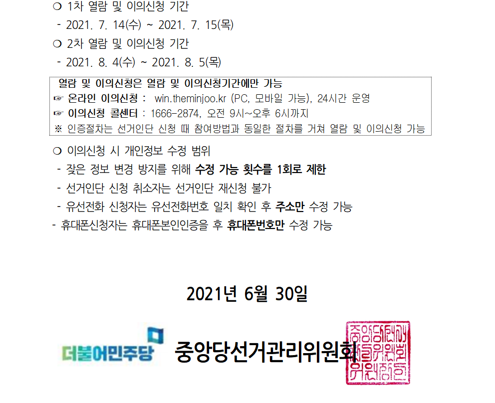2차 국민·일반당원 선거인단 / 1차 재외국민 선거인단 열람 및 이의신청 안내