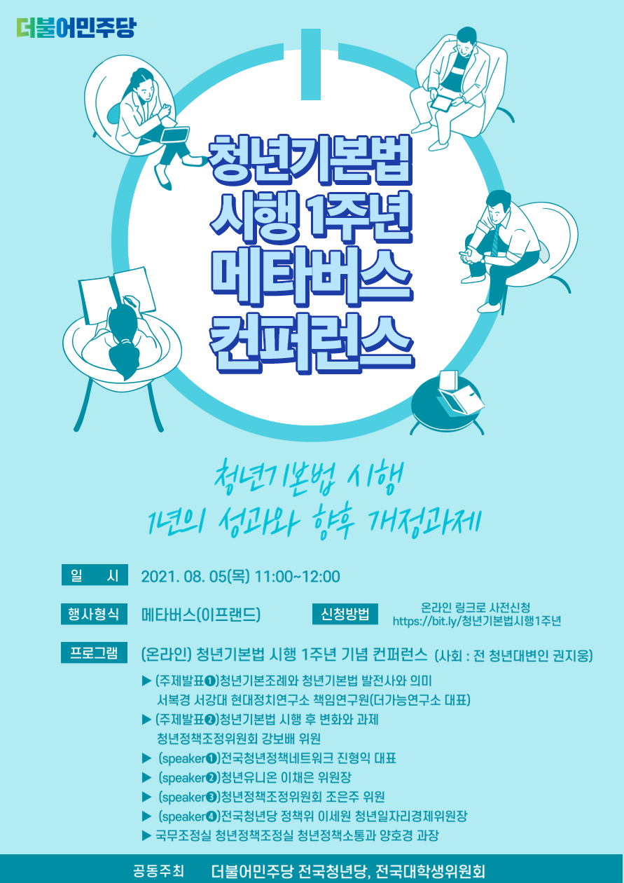 더불어민주당 전국청년당·전국대학생위원회에서 ‘청년기본법 시행 1주년 기념 메타버스(가상공간) 컨퍼런스’를 개최합니다.
